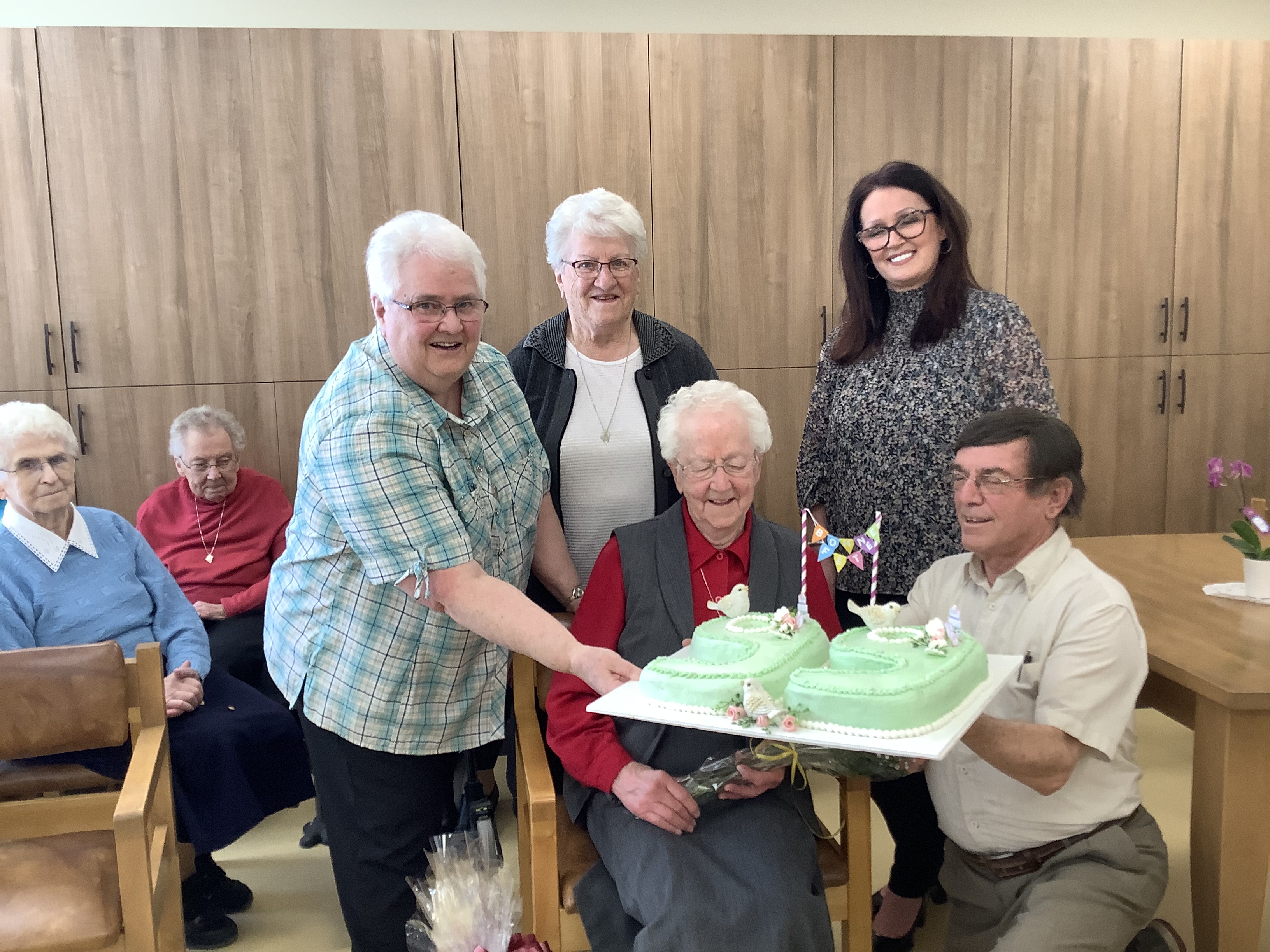 À sa retraite de l’enseignement, notre jubilaire a travaillé douze ans au bureau de la catéchèse à Yarmouth, N.-E. Elle vit présentement au Pavilllon Edmée-Martin de Campbellton où elle fait son chemin comme une jeune femme. Elle a même ses préférences alimentaires : les ailes de poulet et les sandwiches qu’elle demande parfois pour son déjeuner.